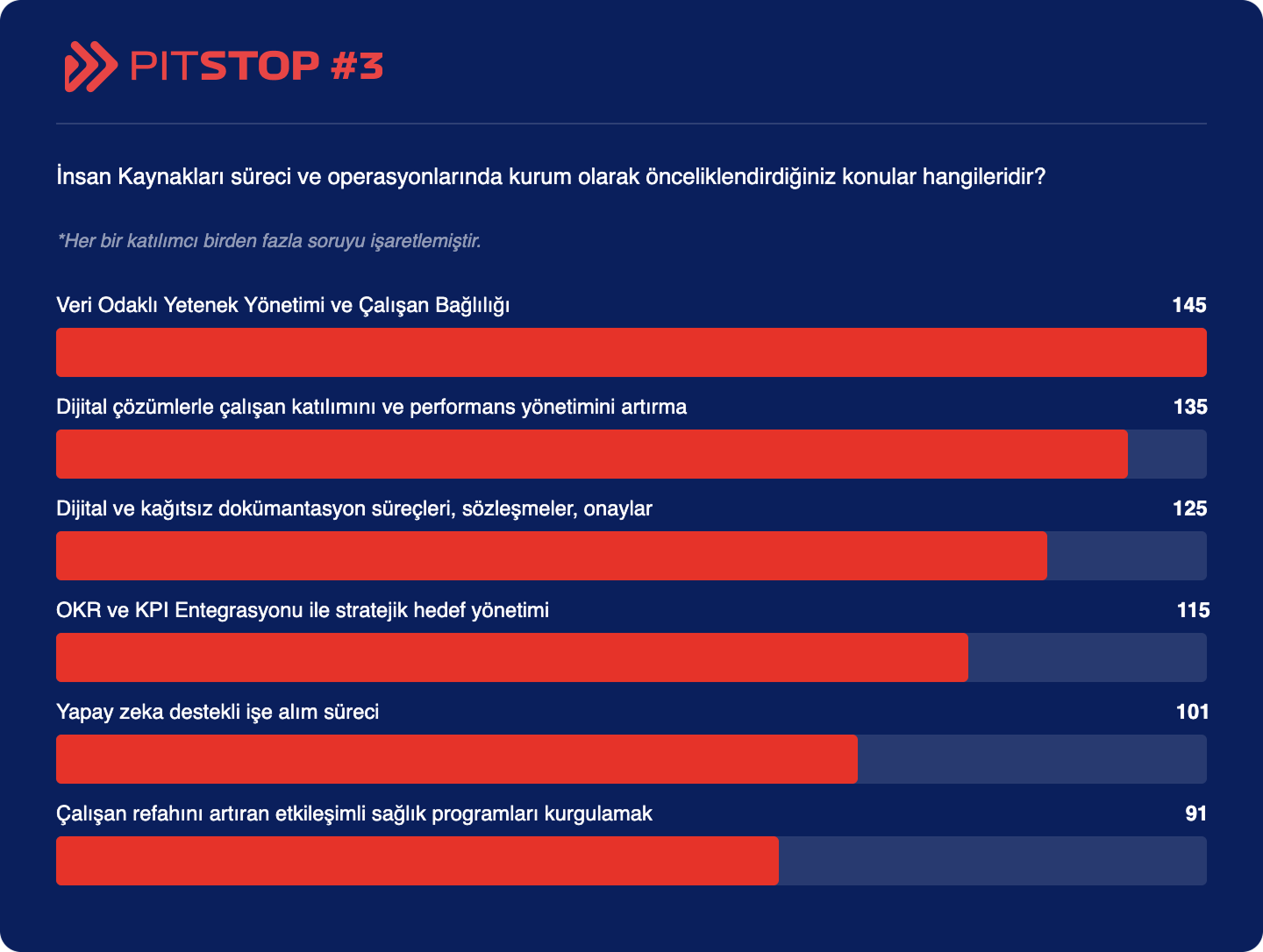 İK süreçlerine yönelik işe alım, uyum & sürdürülebilirlik, verimlilik, performans, iyilik hali ve geri bildirim & yetenek yönetimi ile ilgili altı teknoloji hakkında oturum öncesinde bire bir yapılan anketlerde, kurumsal temsilcilerin İK süreçlerindeki öncelikleri hakkında önemli geri bildirimler toplandı. İşte kurumsal şirketlerin İK süreçlerindeki öncelikleri: